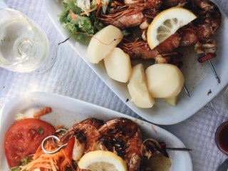 The calamari in the grilled shrimp and calamari skewer was great. Beautifully charred, but juicy and tasty. The shrimp was good. The place is very charming and low-key. Great view, friendly staff.
