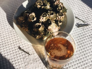 ÓTIMO! Comemos queijo fresco, pão, cracas, lapas e peixe boca negra, acompanhado com o vinho branco da casa Beira Mar. Absolutamente delicioso e o star muito simpático! 10 PONTOS!