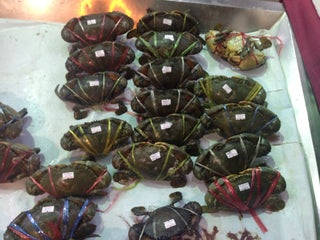 Soft Shell crab, live shrimp bugs, but we were too late for sold out blue crabs.