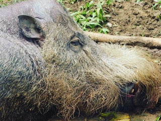Domesticated wild boars roaming about freely
