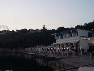 Dama Bianca v Mladininem Konzumu / Na obali devinskega zalivčka lahko posedate in pojedate vsak dan, razen srede, v času v Italiji obče veljavnega termina za kosila ali večerje.