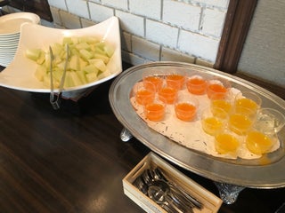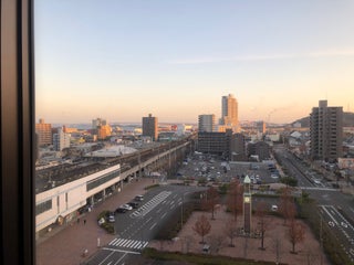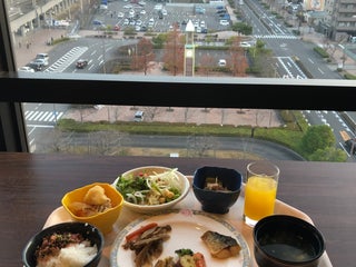 朝食会場の11階の展望レストランは非常に眺めが良くて、宇多津駅前からプレイパークゴールドタワー、晴れていれば岡山へと続く瀬戸中央自動車道の南備讃瀬戸大橋、北備讃瀬戸大橋、岩黒島橋、櫃石島橋まで見ることが出来ます。